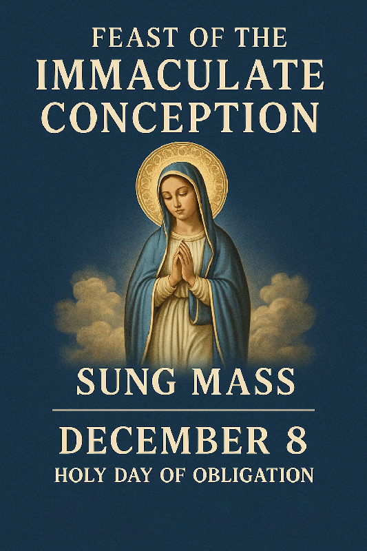 We joyfully invite you to celebrate the Feast of the Immaculate Conception, a Holy Day of Obligation. An English Sung Mass will be offered in honor of Our Blessed Mother. Join us as we give thanks for the grace of Mary’s Immaculate Conception and ask for her intercession for our parish and families.