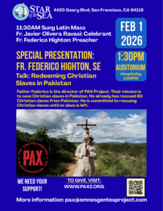 11:30 AM – Sung TLM (Celebrant: Fr. Javier Ravasi; Preacher: Fr. Federico Highton) 1:00 PM – Hospitality 1:30 PM – Conference in English by Fr. Federico Highton: Redeeming Christian Slaves in Pakistan, 2026 (Auditorium)