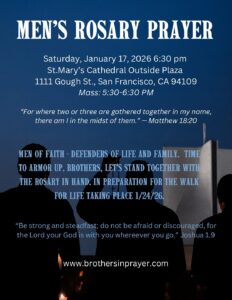 MEN OF FAITH - DEFENDERS OF LIFE AND FAMILY. Time to armor up. Brothers, let’s stand together with the Rosary in hand. In preparation for the Walk for life taking place 1/24/26. Saturday, January 17, 2026, 6:30 pm St.Mary’s Cathedral Outside Plaza , 1111 Gough St., San Francisco, CA 94109 Mass: 5:30-6:30 PM