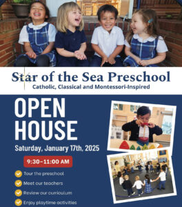 Join us on January 17 from 9:30 to 11:00 a.m. for our Preschool Open House. Families are invited to tour the preschool, meet our teachers, learn about our curriculum, and enjoy fun, playful activities. This is a wonderful opportunity to experience our learning environment and discover what makes Star of the Sea Preschool special.