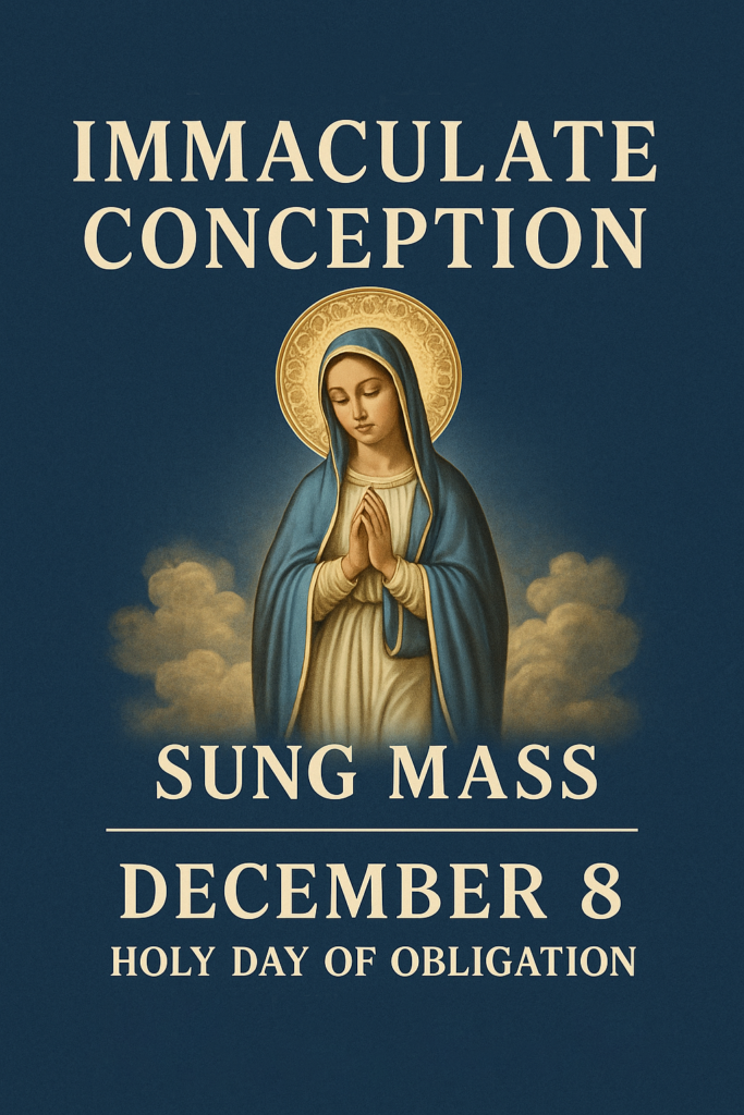 We joyfully invite you to celebrate the Feast of the Immaculate Conception of the Blessed Virgin Mary, a Holy Day of Obligation. English Sung Masses will be offered in honor of Our Blessed Mother.