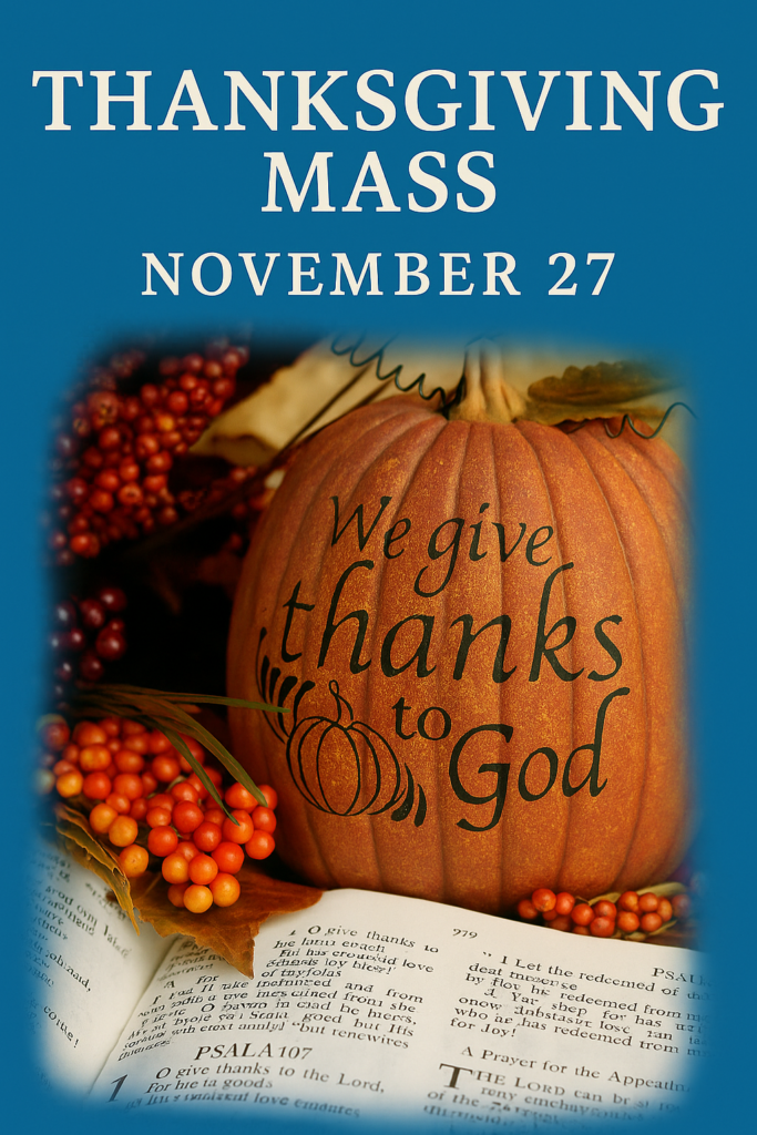 You are invited to a Thanksgiving English Mass, celebrated in gratitude for the many graces and blessings bestowed upon our parish and community. Together, let us offer thanks to God and unite in prayerful celebration.