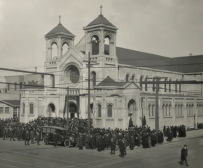By 1870 sports fans had built the Bay District Track for horseracing around Arguello and Geary, and a few enterprising Irishmen established horse ranches, farms, and public houses among the rolling dunes. At one point there were more horses than people, and then there were more cows than horses and people, but the Irishmen got to work having large families. These families needed a Catholic Church. They had been making the trip to Old Saint Mary’s Cathedral east of Nob Hill, and then to the much closer cemetery chapel of the Holy Cross on Eddy at Divisadero (now a Buddhist Monastery, but still bearing the façade inscription Sanctae Crucis, or “of the Holy Cross”). In 1886 forty-one Catholic families felt “strong enough” to maintain a church of their own. The first Mass was celebrated at Farrell’s Dance Hall at Ninth and Geary on Easter Sunday 1887. Within a year the Irishmen had built their own 500-seat framework building at a cost of $10,000. It would be six years before the church was promoted from mission outpost to fully independent parish.